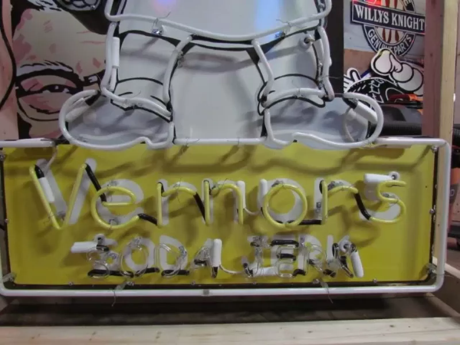 Our neon glass benders all have over 25 years each bending glass & their work is flawless. The faces of our signs are clean & pop for that for that perfect look. The backside of our signs have a 6" deep metal enclosure (can) that contains the best parts available today including the glass housings, wiring, self regulating transformers, mechanical chasers or spellers, wall brackets & roof hook supports & support framework for our larger signs.