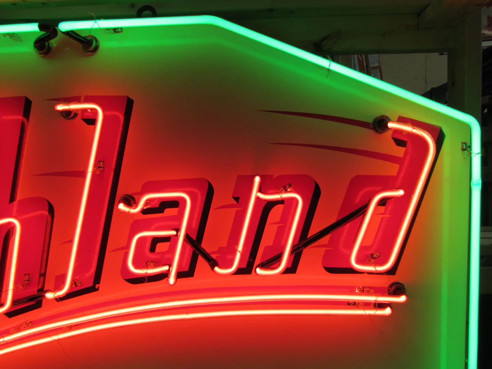 Please do not confuse our neon signs with the neon signs being sold in the large car auctions around the country. Our new signs are painted just like they were in the 1940's & 1950's. Most new signs at the auctions are either clear-coated vinyl or screen-printed. Our new painted signs are built the same as tin painted signs from the 1930's - 1950's. The only difference is instead of tin we are using factory primed aluminum.