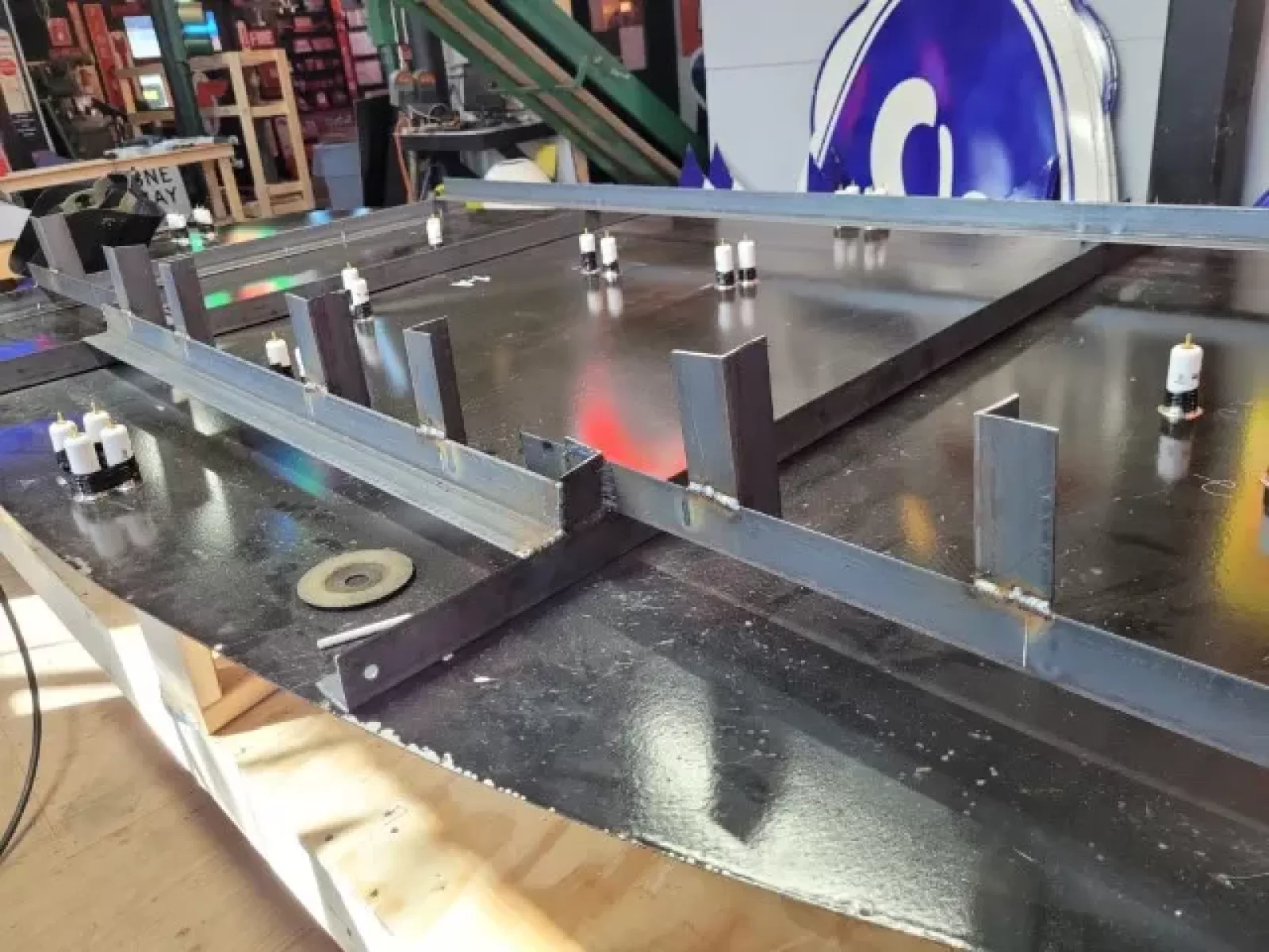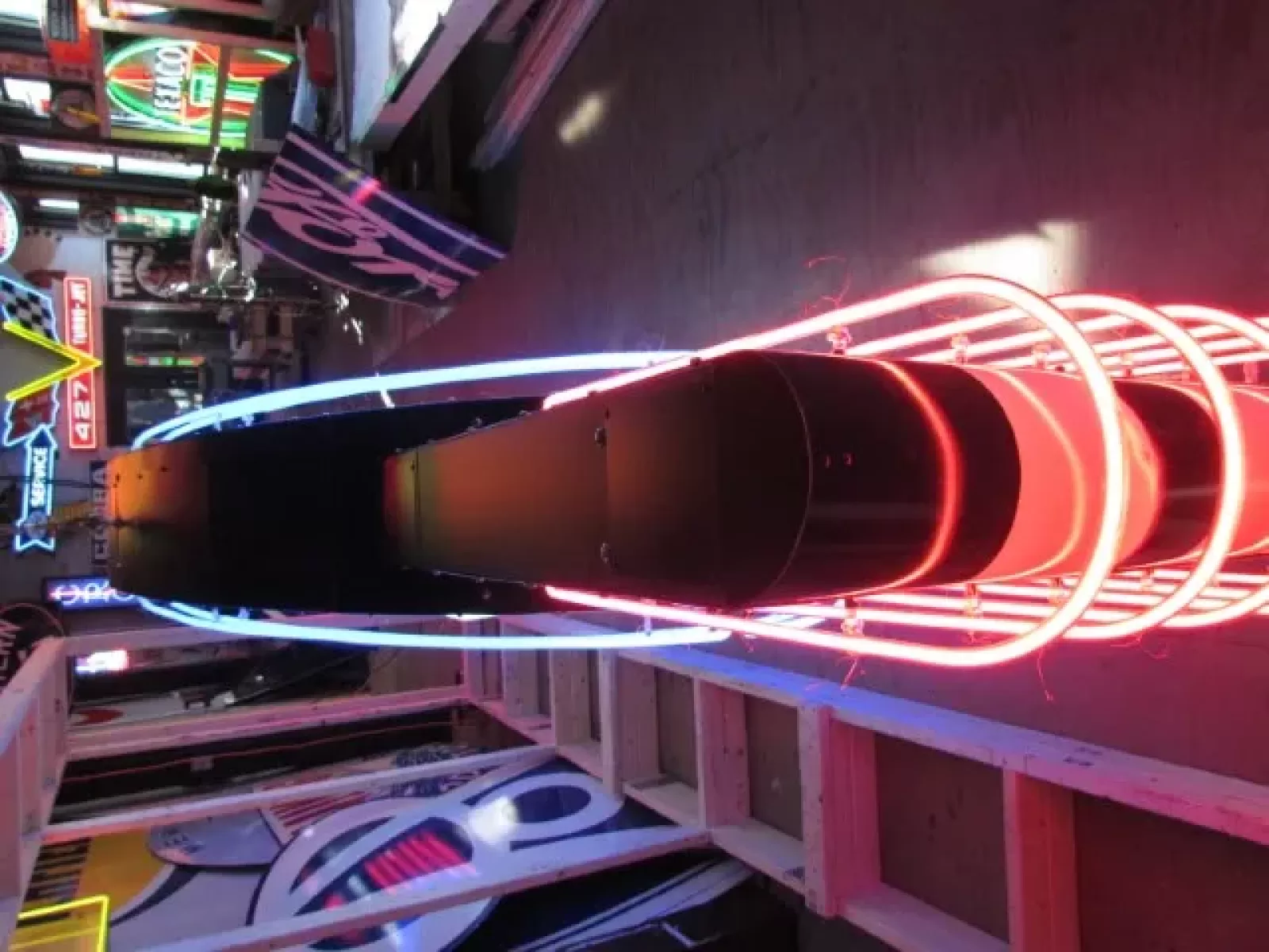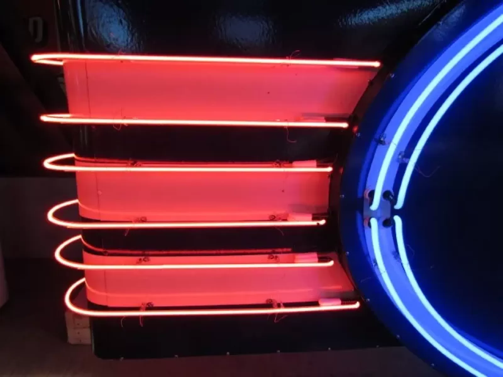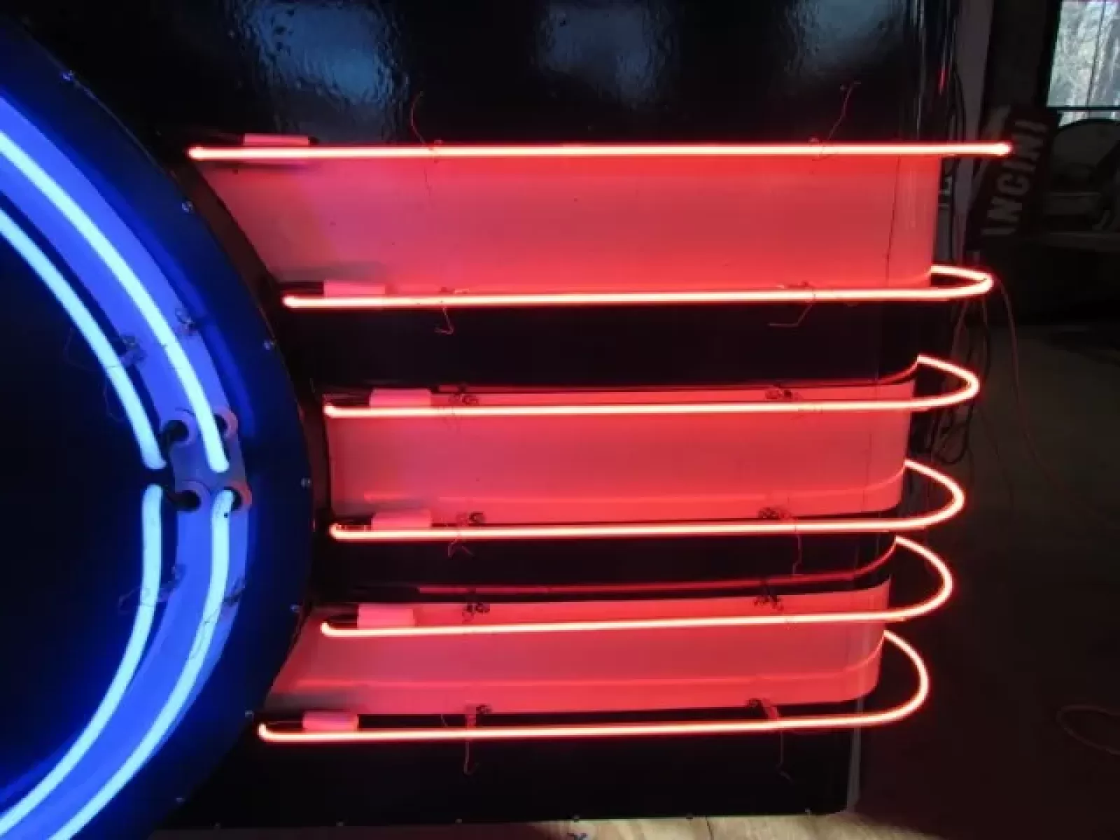 Our neon glass benders all have over 25 years each bending glass & their work is flawless. The faces of our signs are clean & pop for that for that perfect look. The backside of our signs have a 6" deep metal enclosure (can) that contains the best parts available today including the glass housings, wiring, self regulating transformers, mechanical chasers or spellers, wall brackets & roof hook supports & support framework for our larger signs.