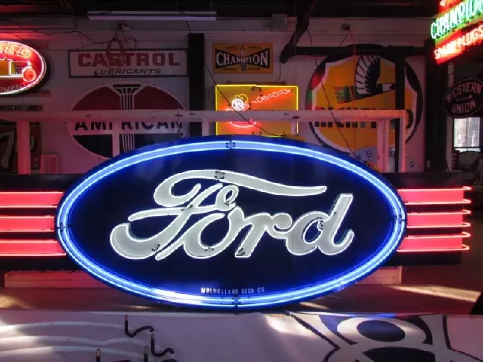 Please do not confuse our neon signs with the neon signs being sold in the large car auctions around the country. Our new neon signs are new porcelain or painted just like they were in the 1940's & 1950's. Most new signs at the auctions are either clear-coated vinyl or screen-printed. Our new signs are built the same as the neon signs from the 1930's - 1950's. The only difference is instead of tin we are using factory primed aluminum & new porcelain.