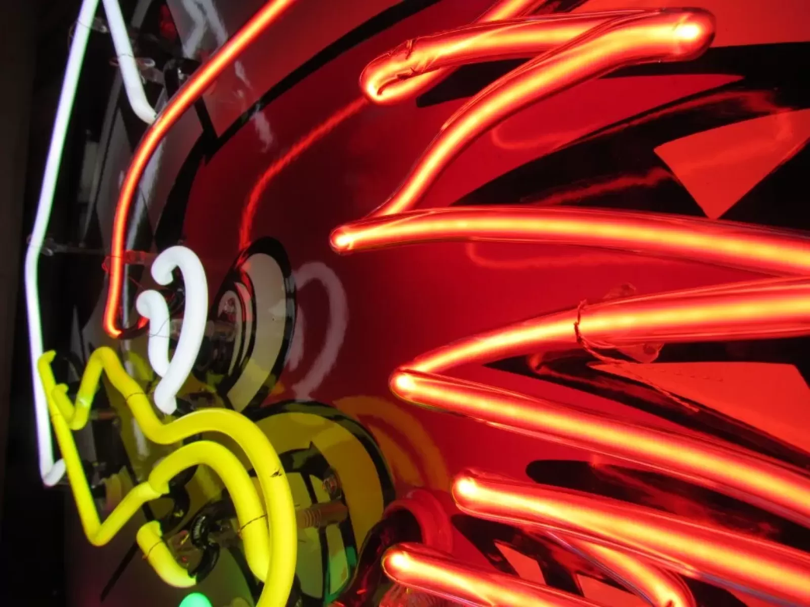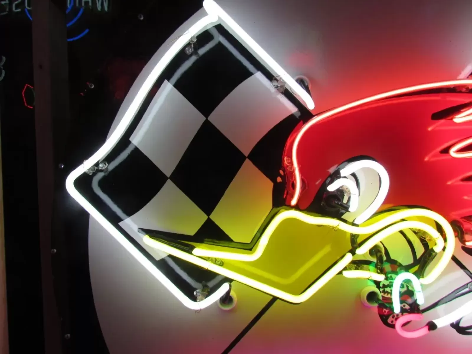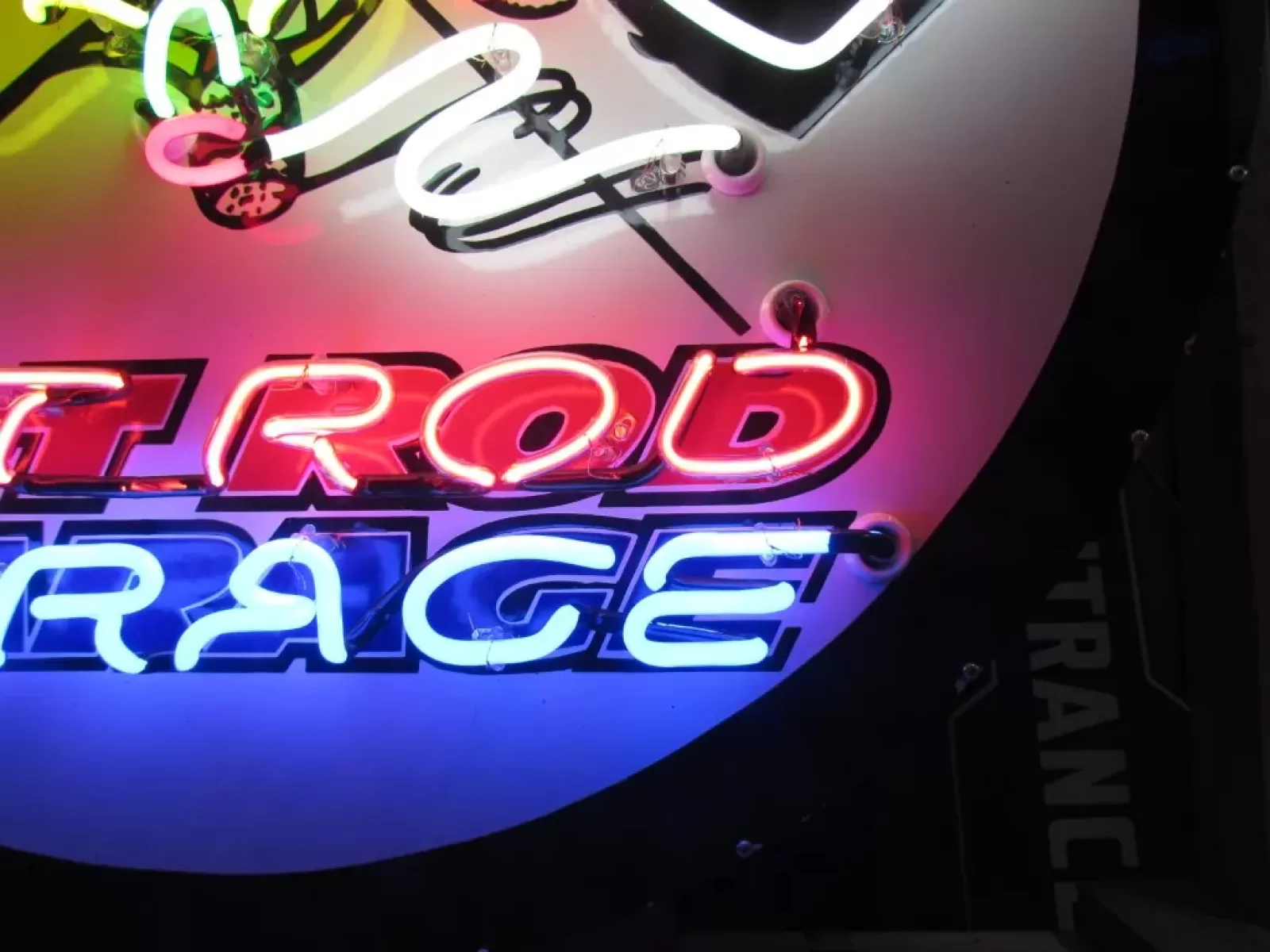 Our neon glass benders all have over 25 years each bending glass & their work is flawless. The faces of our signs are clean & pop for that for that perfect look. The backside of our signs have a 6" deep metal enclosure (can) that contains the best parts available today including the glass housings,  wiring,  self regulating transformers, mechanical chasers or spellers, wall brackets & roof hook supports & support framework for our larger signs.