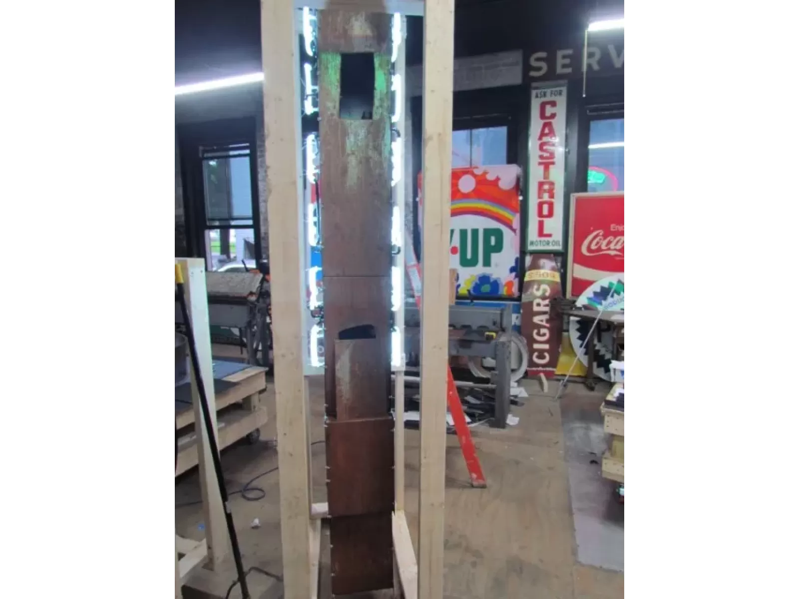 Our neon glass benders all have over 25 years each bending glass & their work is flawless. The faces of our signs are clean & pop for that for that perfect look. The backside of our signs have a 6" deep metal enclosure (can) that contains the best parts available today including the glass housings, wiring, self regulating transformers, mechanical chasers or spellers, wall brackets & roof hook supports & support framework for our larger signs.