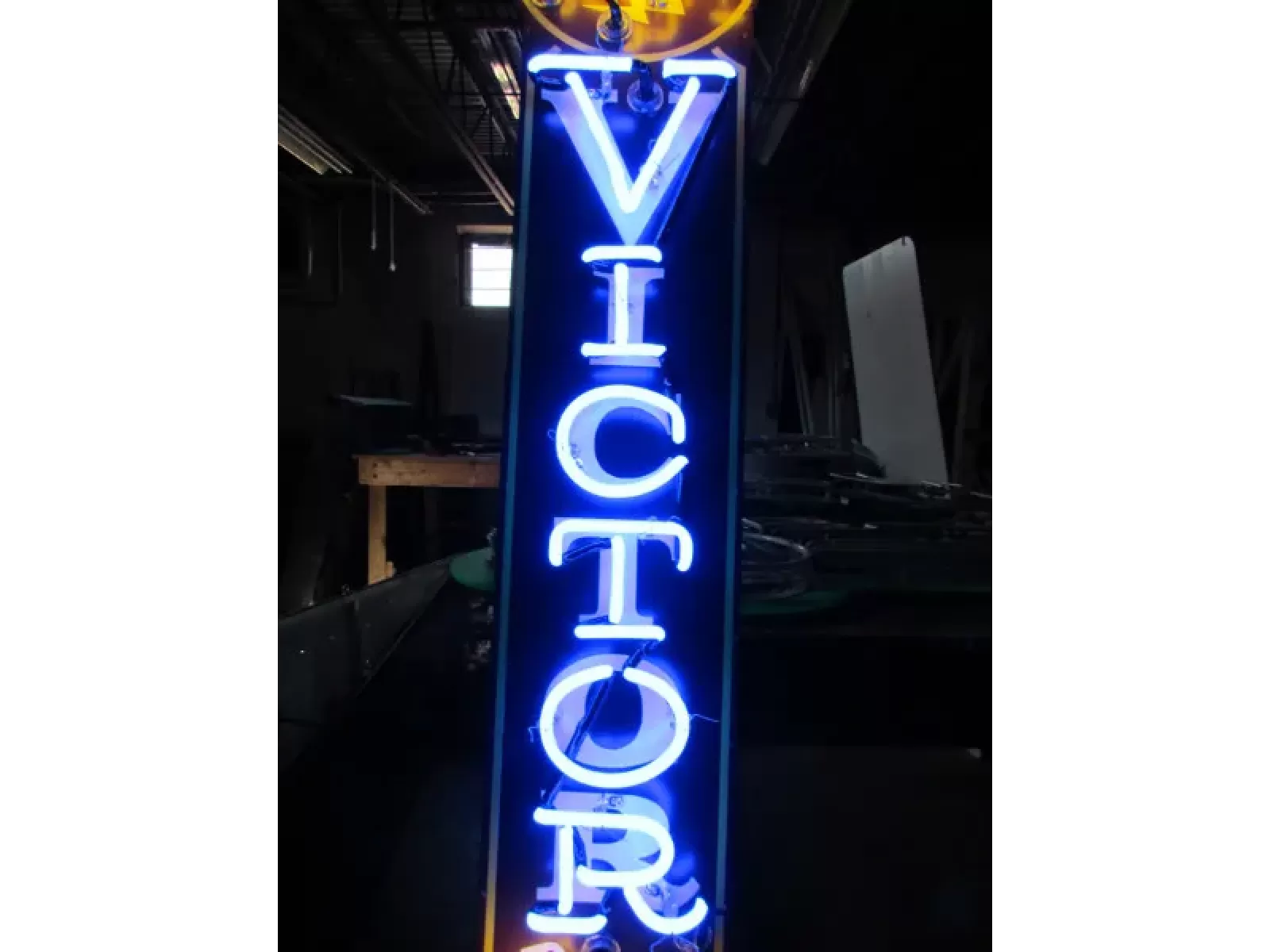 Please do not confuse our neon signs with the neon signs being sold in the large car auctions around the country. Our new neon signs are new porcelain or painted just like they were in the 1940's & 1950's. Most new signs at the auctions are either clear-coated vinyl or screen-printed. Our new signs are built the same as the neon signs from the 1930's - 1950's. The only difference is instead of tin we are using factory primed aluminum & new porcelain.