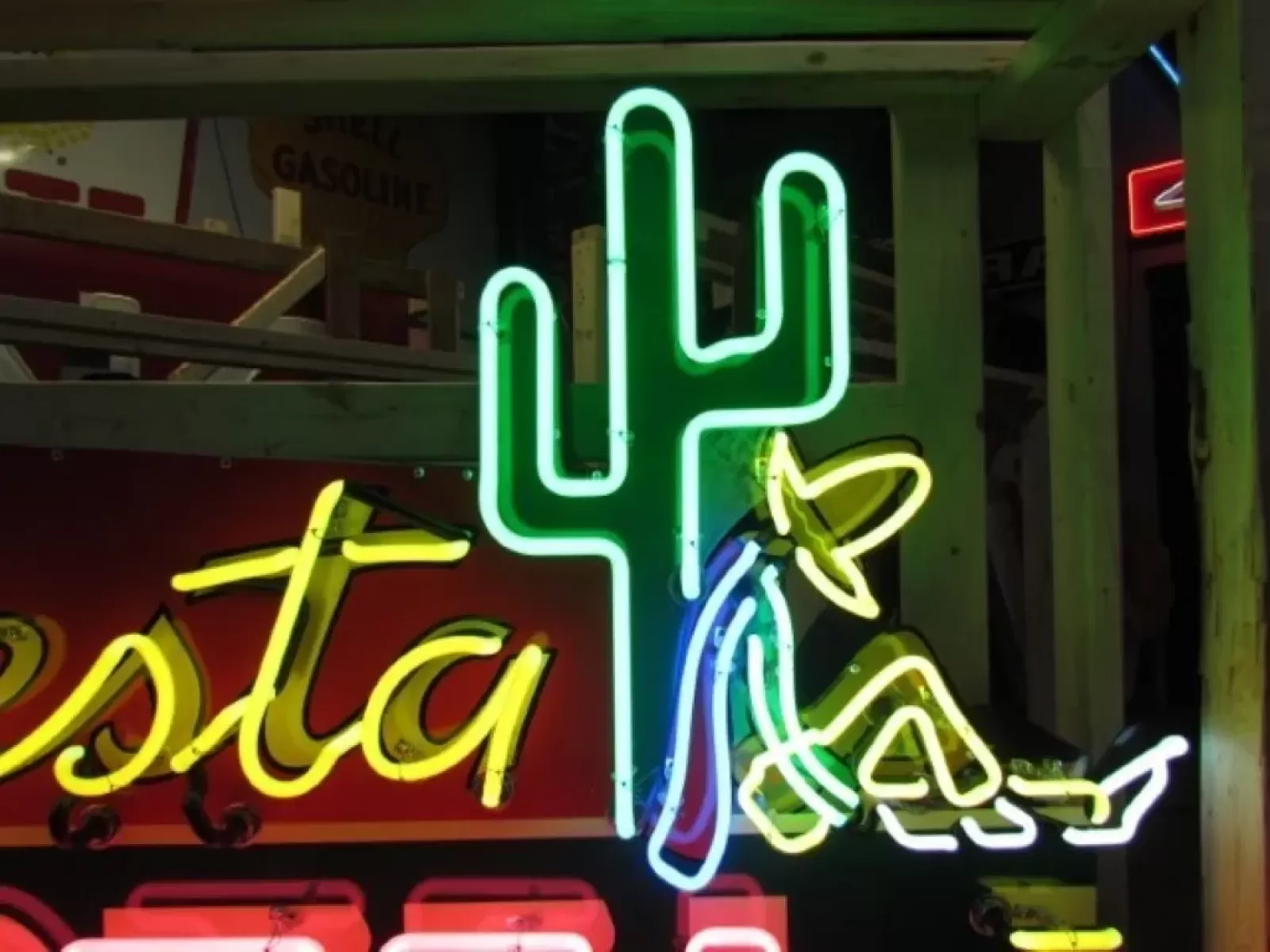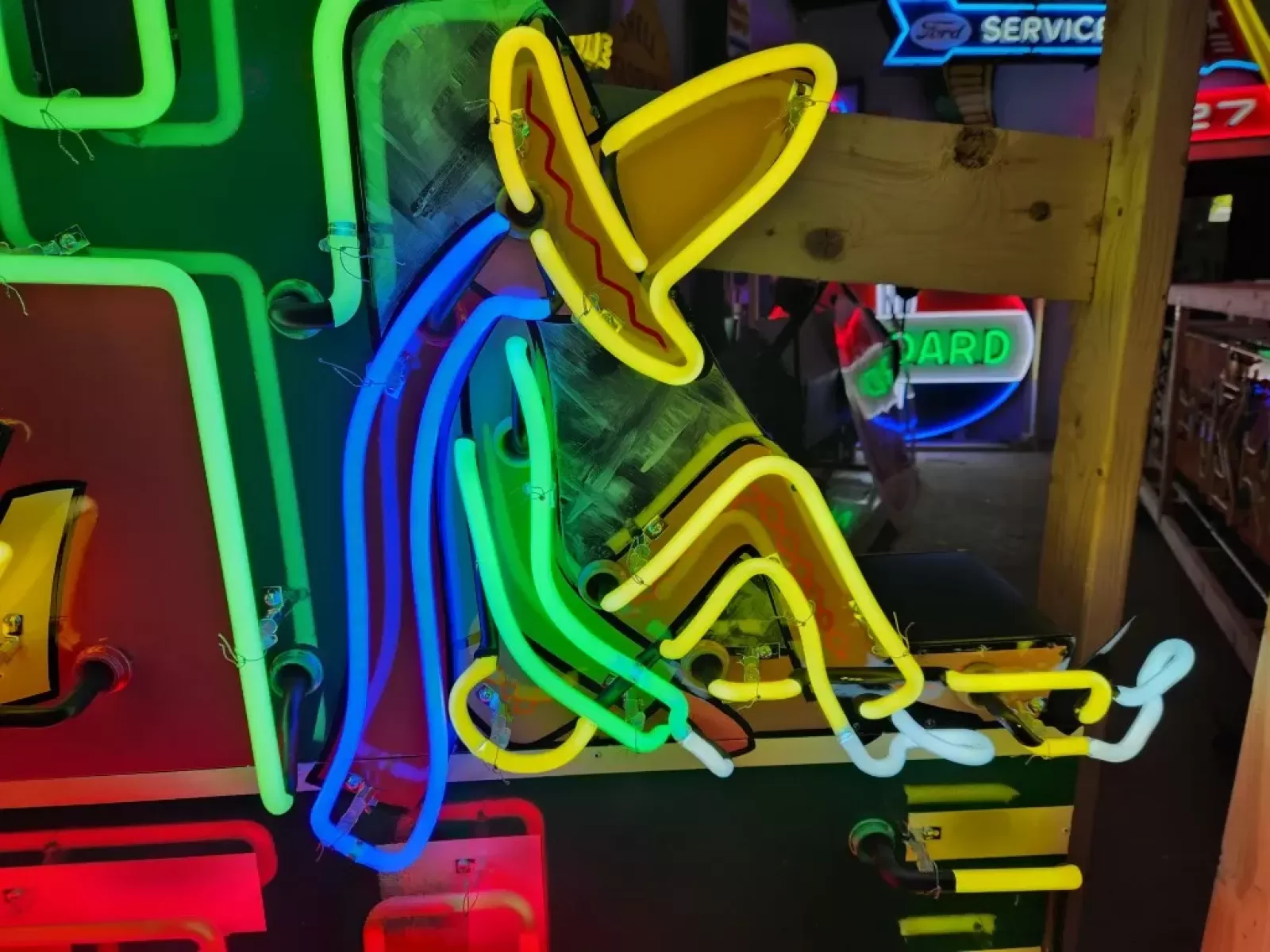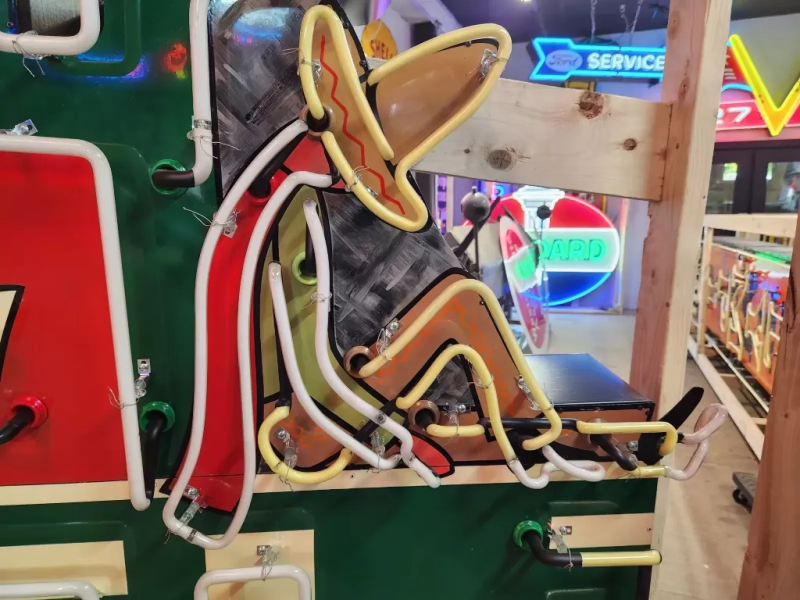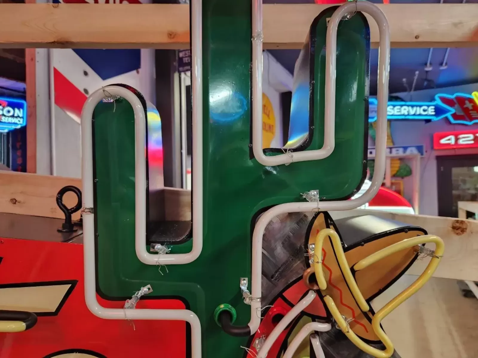 Our neon glass benders all have over 25 years each bending glass & their work is flawless. The faces of our signs are clean & pop for that for that perfect look. The backside of our signs have a 6" deep metal enclosure (can) that contains the best parts available today including the glass housings, wiring, self regulating transformers, mechanical chasers or spellers, wall brackets & roof hook supports & support framework for our larger signs.