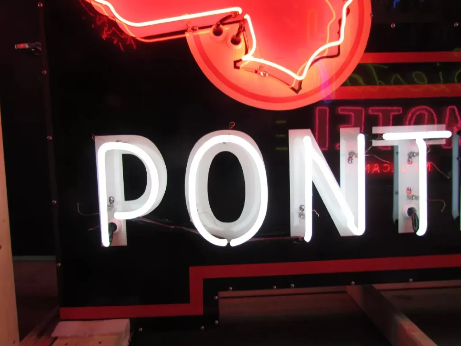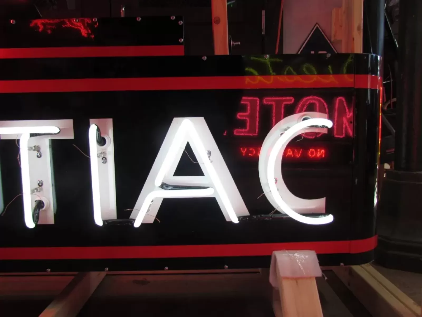 Our neon glass benders all have over 25 years each bending glass & their work is flawless. The faces of our signs are clean & pop for that for that perfect look. The backside of our signs have a 6" deep metal enclosure (can) that contains the best parts available today including the glass housings,  wiring,  self regulating transformers, mechanical chasers or spellers, wall brackets & roof hook supports & support framework for our larger signs.