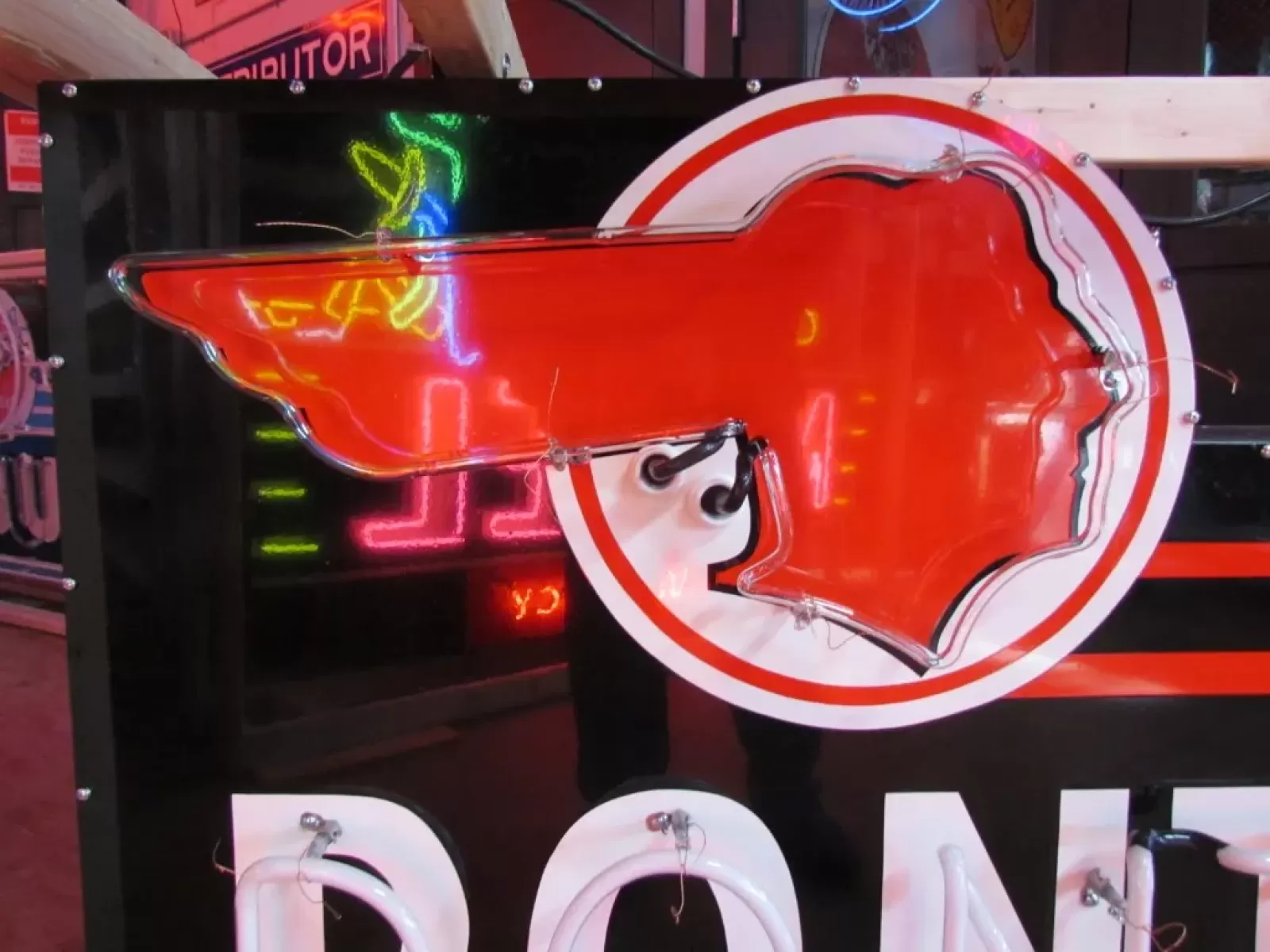 Please do not confuse our neon signs with the neon signs being sold in the large car auctions around the country. Our new signs are painted just like they were in the 1940's & 1950's. Most new signs at the auctions are either clear-coated vinyl or screen-printed. Our new painted signs are built the same as tin painted signs from the 1930's - 1950's. The only difference is instead of tin we are using factory primed aluminum.
