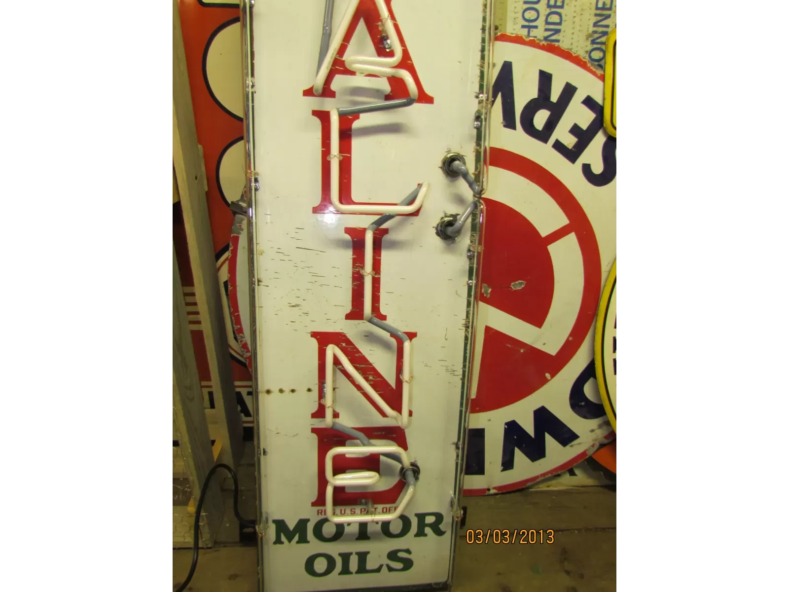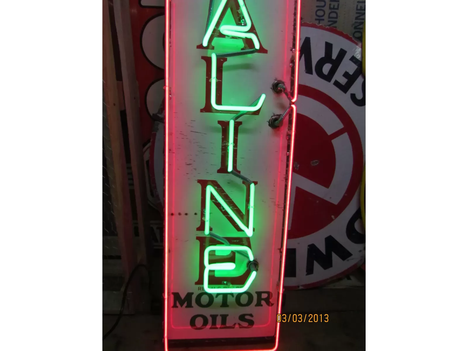 Please do not confuse our neon signs with the neon signs being sold in the large car auctions around the country. Our new neon signs are new porcelain or painted just like they were in the 1940's & 1950's. Most new signs at the auctions are either clear-coated vinyl or screen-printed. Our new signs are built the same as the neon signs from the 1930's - 1950's. The only difference is instead of tin we are using factory primed aluminum & new porcelain.