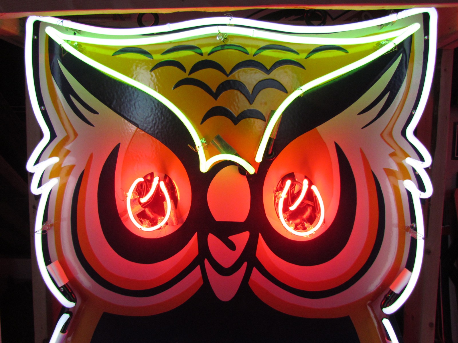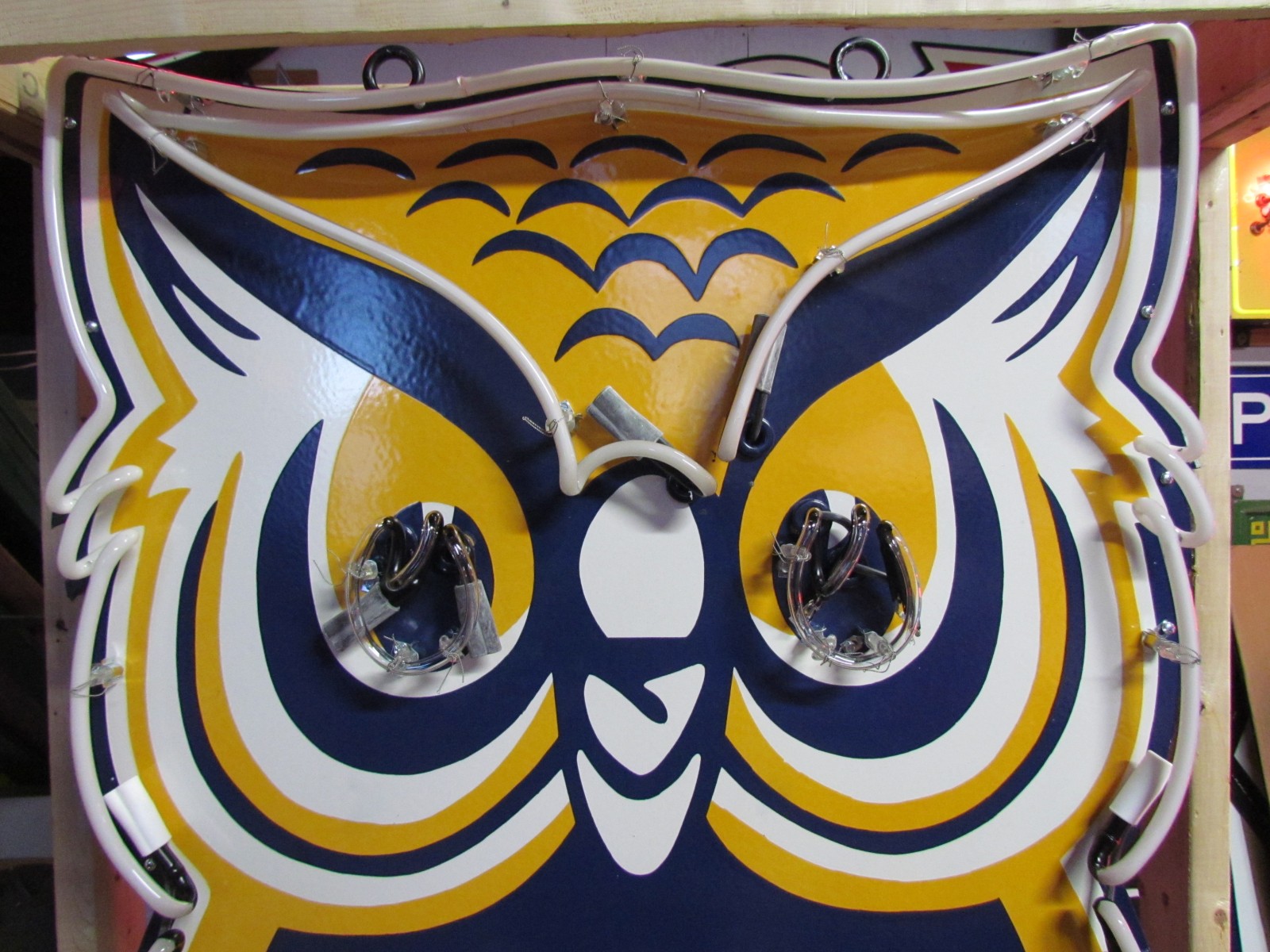 Our neon glass benders all have over 25 years each bending glass & their work is flawless. The faces of our signs are clean & pop for that for that perfect look. The backside of our signs have a 6" deep metal enclosure (can) that contains the best parts available today including the glass housings, wiring, self regulating transformers, mechanical chasers or spellers, wall brackets & roof hook supports & support framework for our larger signs.